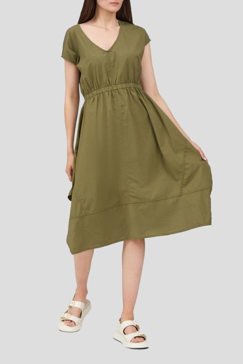 Детали: Женское хлопковое платье цвета хаки от Deha (Деха). V-образный вырез, короткий рукав, боковые карманы, длина-миди. Параметры модели: 78-62-92, рост 179 см. На модели надет: M размер