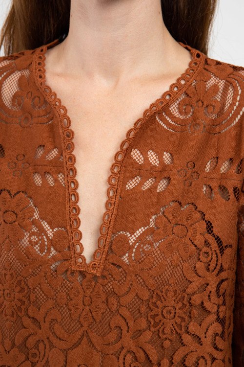 Женское коричневое хлопковое платье от Clips (Клипс). Ажурный узор по всей поверхности, V-образный вырез, укороченный рукав, свободный фасон, длина до колен.