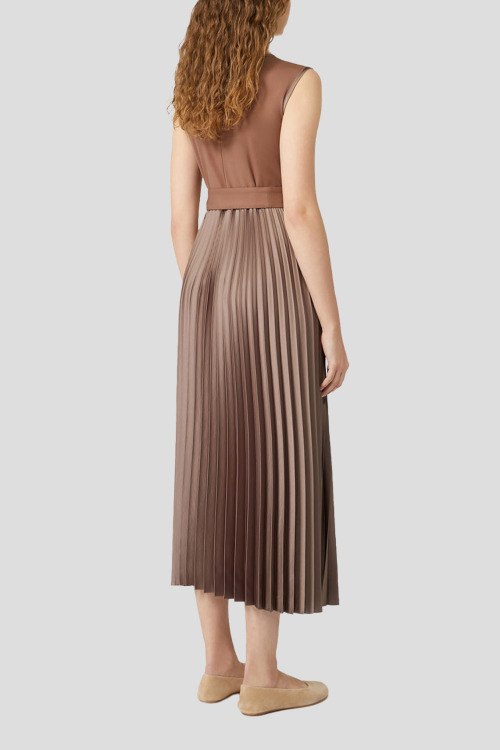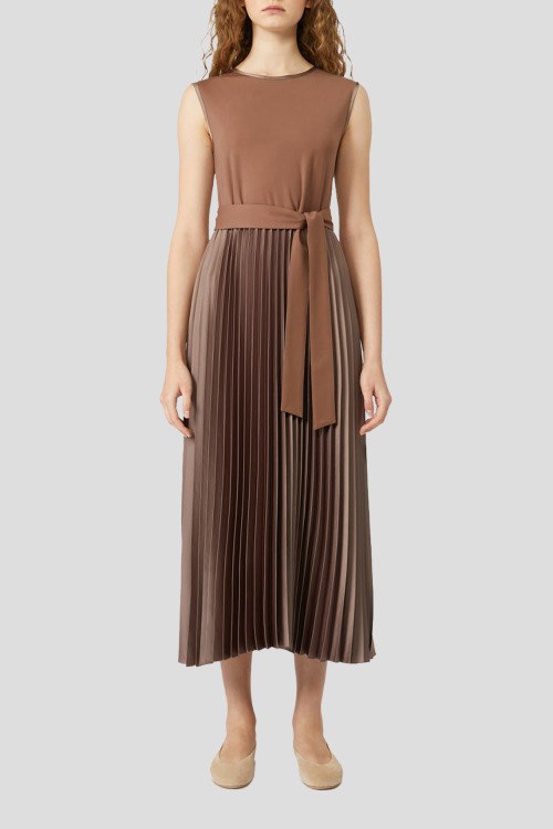 Детали: Женское коричневое платье Samuele от Max Mara Weekend (Макс Мара Викенд). Модель без рукавов, круглый вырез горловины, в талии с поясом, плиссированная юбка, длина-миди