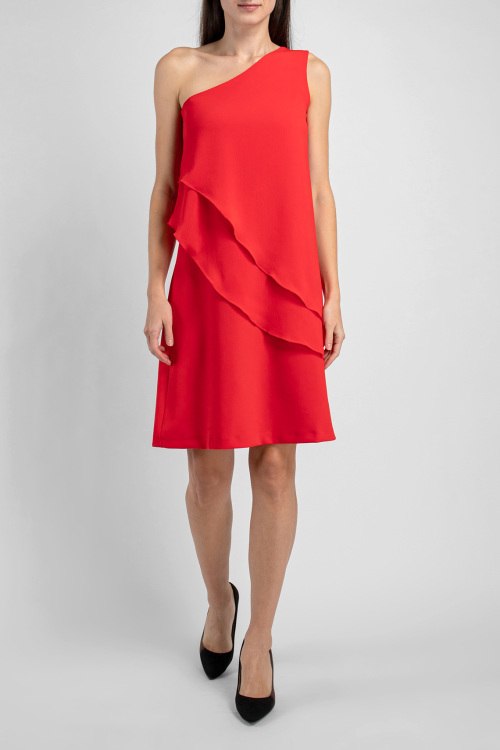 Женское красное платье из полиэстера от Save the Queen (Сейв зе Квин). Длина до колен, свободный силуэт, модель на одно плечо, без рукавов, дизайн с оборкой, металлический значок с логотипом бренда на спине.