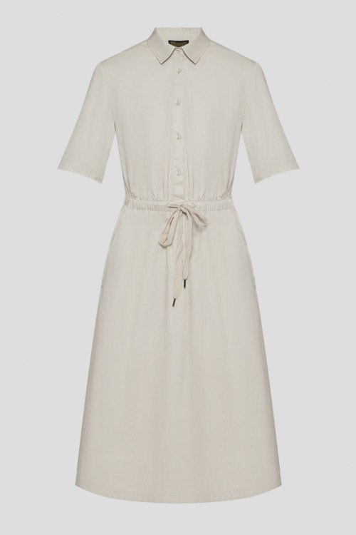 Детали: Женское хлопковое платье-рубашка молочного оттенка от Blauer (Блауэр). Отложной воротник, боковые карманы, застежка на пуговицы, в талии на кулиске, короткий рукав, длина-миди. Длина рукава: короткий, для размера S - 28 см, обхват груди: для размера S - 92 см, обхват талии: для размера S - 76 см, обхват бедер: для размера S - 138 см, длина изделия по среднему шву спинки от горловины: для размера S - 112 см