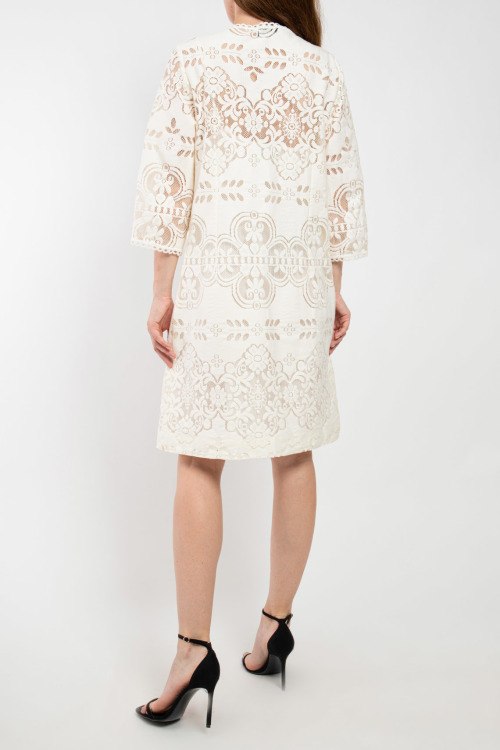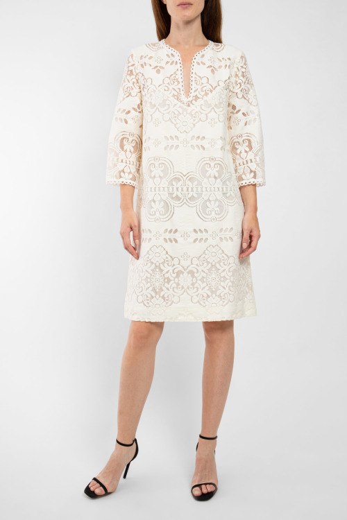 Женское хлопковое платье молочного оттенка от Clips (Клипс). Ажурный узор по всей поверхности, V-образный вырез, укороченный рукав, свободный фасон, длина до колен.