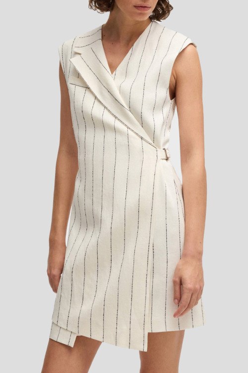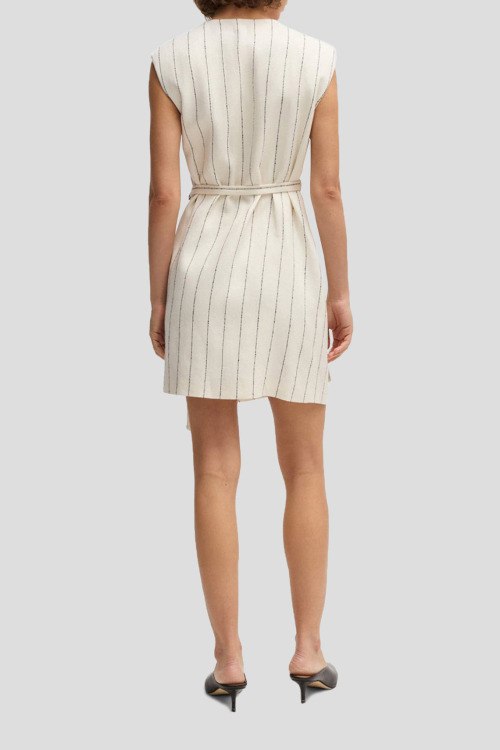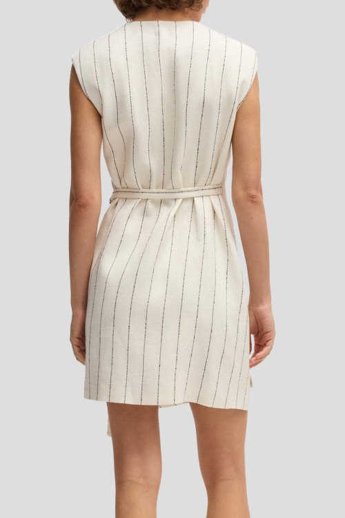 Детали: Женское платье молочного оттенка из льна и вискозы от Hugo Boss (Хуго Босс). Дизайн на запах, тонкая полоска по всей поверхности, V-образный вырез, без рукавов, асимметричный нижний край, длина до колен