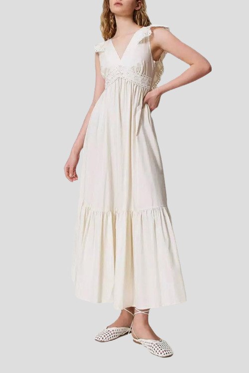 Детали: Женское кремовое платье из хлопка от TWINSET (Твинсет). Длина миди, V-образный вырез горловины и на спине, широкие бретели, расклешенная юбка