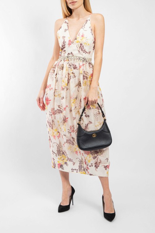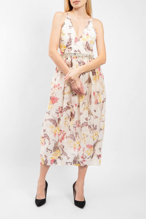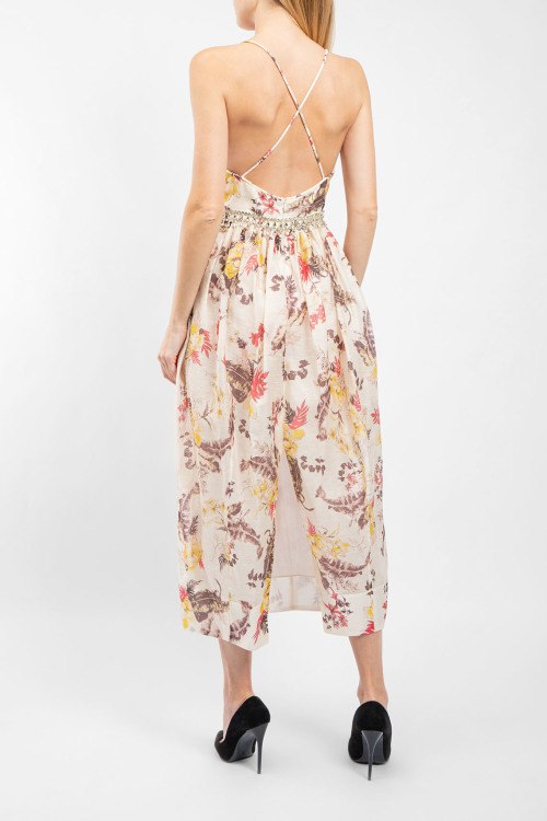 Женское кремовое платье из льна и шелка Matchmaker Tulip от Zimmermann (Циммерманн). Модель на тонких бретельках, V-образный вырез, открытая спинка, цветочный принт, декор кристаллами на талии, длина-миди.