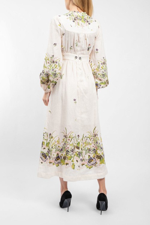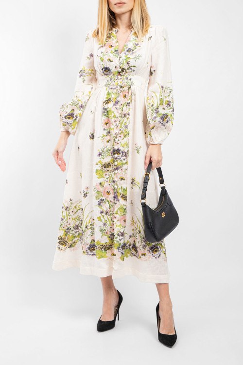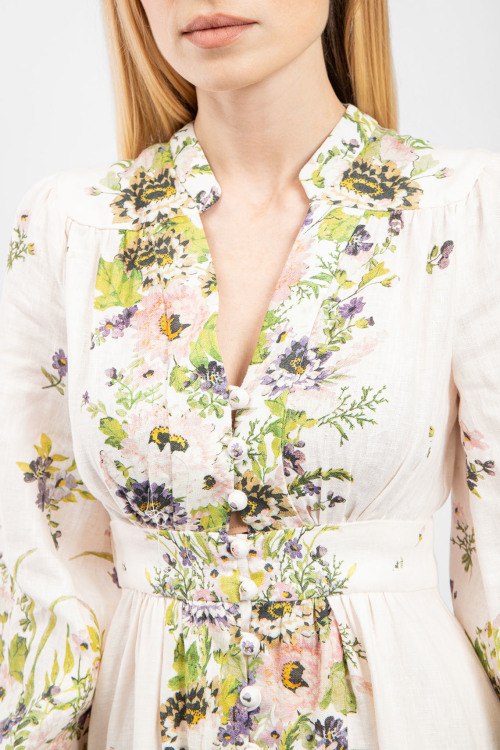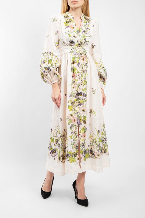 Женское кремовое льняное платье Halliday Plunge от Zimmermann (Циммерманн). Цветочный принт по всей поверхности, воротник-стойка, V-образный вырез, длинный широкий рукав, разрез спереди, длина-миди.