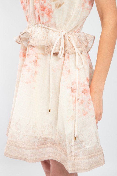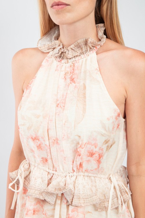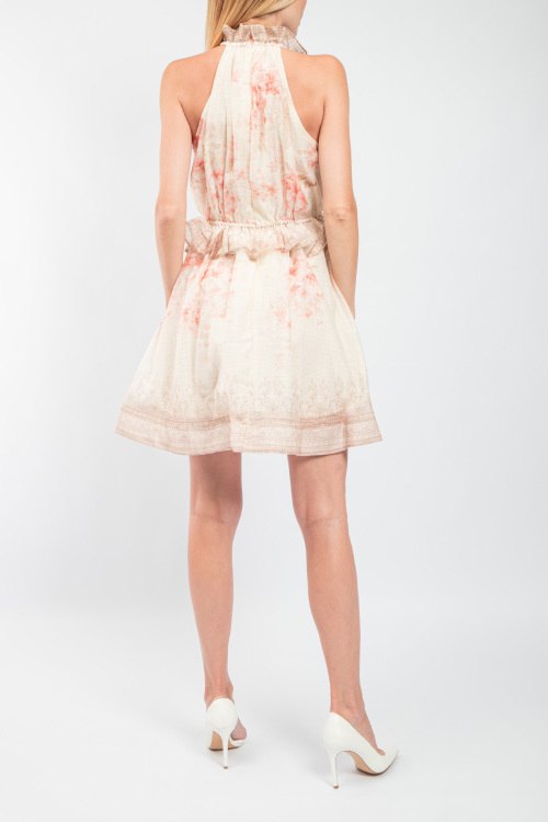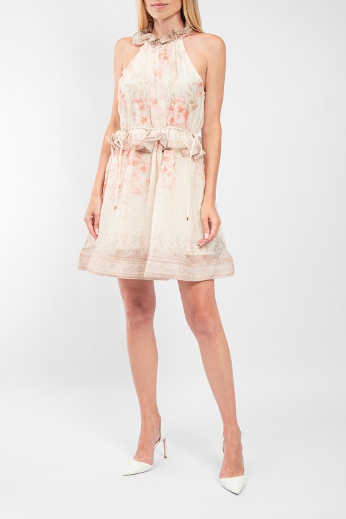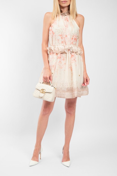 Женское хлопковое платье молочного оттенка Illuminate Halter от Zimmermann (Циммерманн). Модель без рукавов, цветочный принт, оборки на талии, короткая длина.