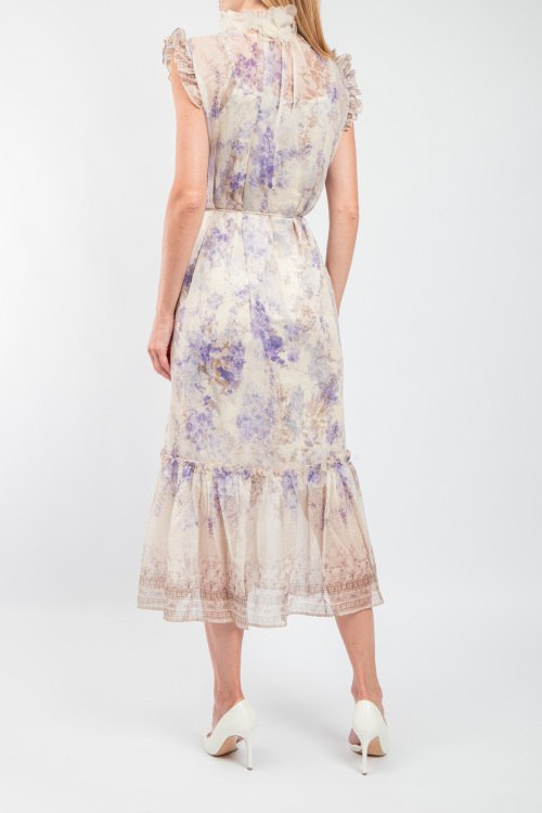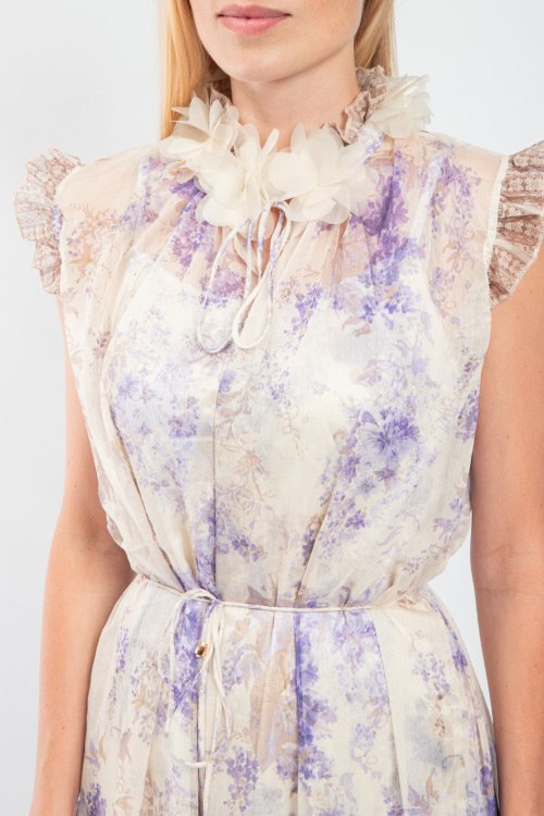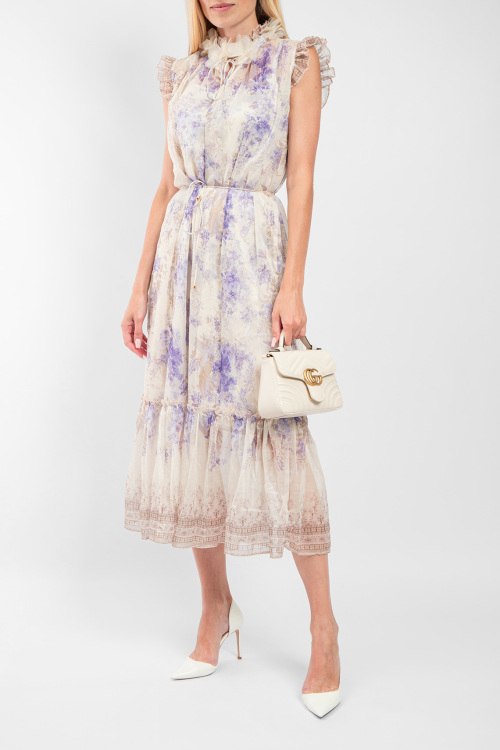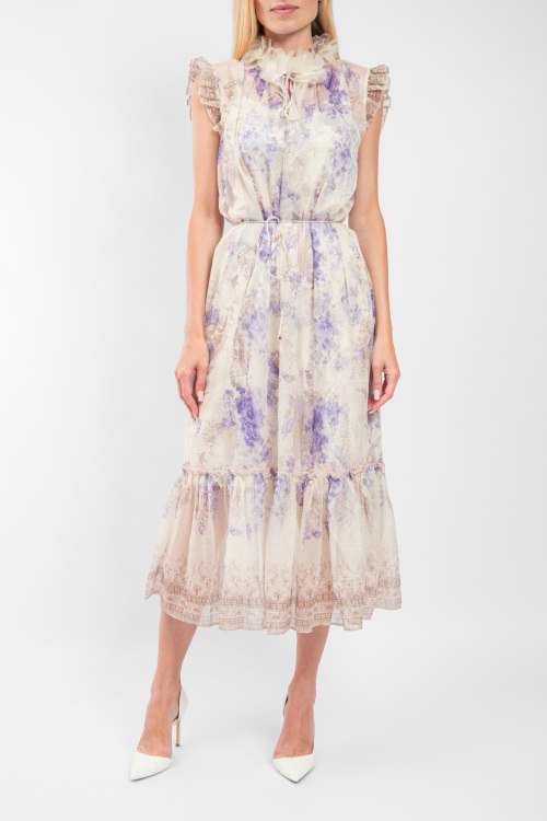 Женское шелковое платье молочного оттенка от Zimmermann (Циммерманн). Цветочный принт, рукава-крылышки, воротник-стойка с цветочным декором, завязки на талии, длина-миди.