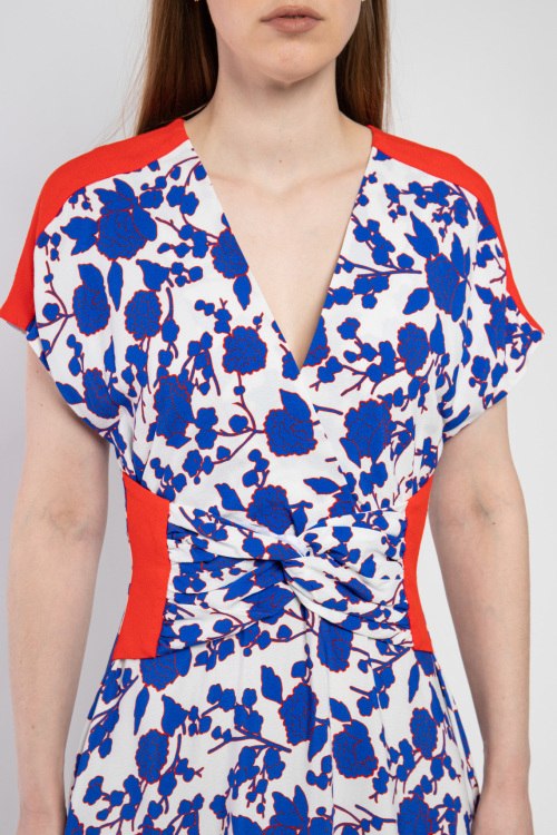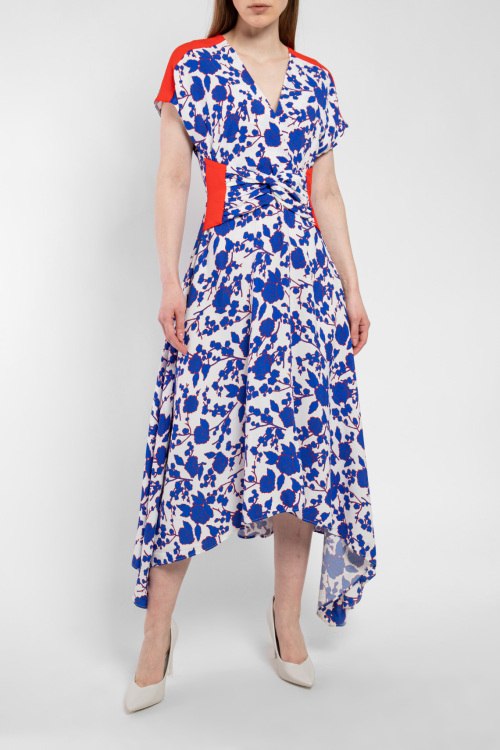 Женское платье из вискозы от Pinko (Пинко). Цветочный принт, V-образный вырез декольте, короткий рукав, алые вставки, застежка-молния на спине, асимметричный нижний край, длина-миди.