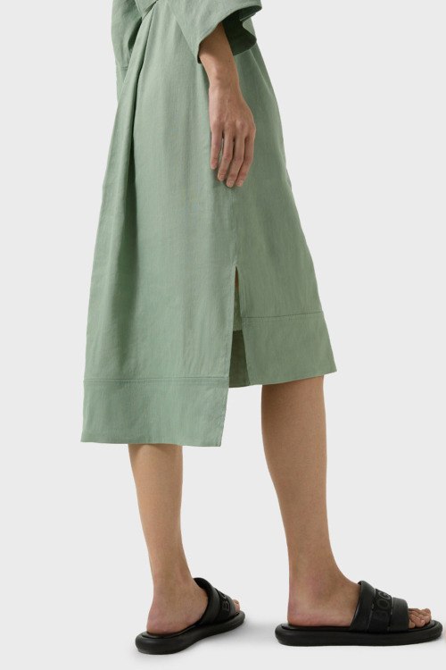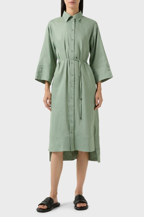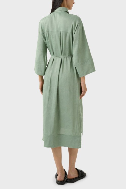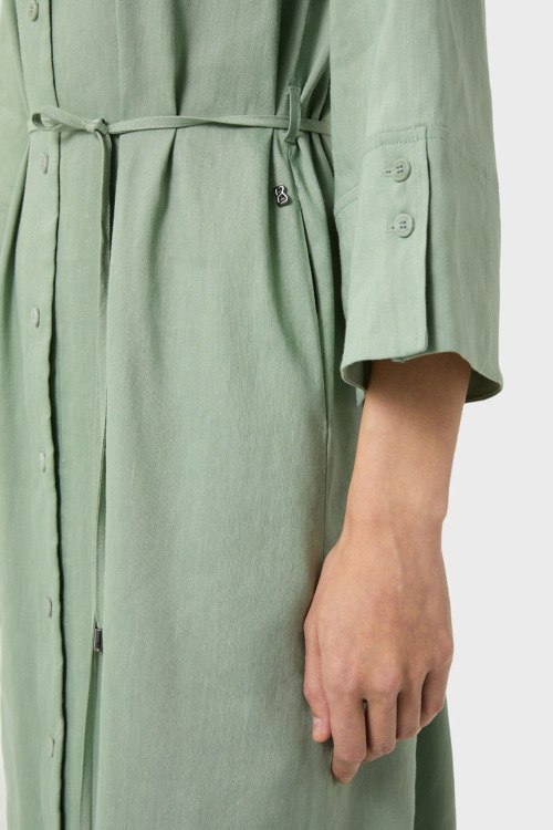 Детали: Женское мятное платье-рубашка Reika из льняного микса от Bogner (Богнер). Длина миди, классический воротник, застежка на пуговицы, укороченные рукава, удлиненная длина по спинке, тонкий пояс в тон изделия