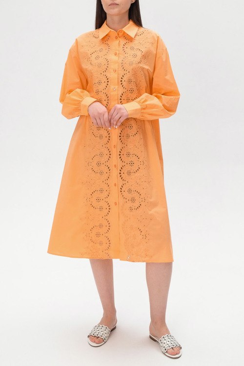 Детали: Женское оранжевое хлопковое платье-рубашка от TWINSET (Твинсет). Цветочная вышивка, отложной воротник, застежка на пуговицы по всей длине, длинный рукав на манжетах, свободный фасон, длина-миди