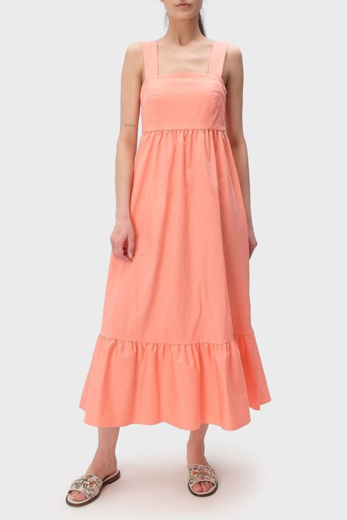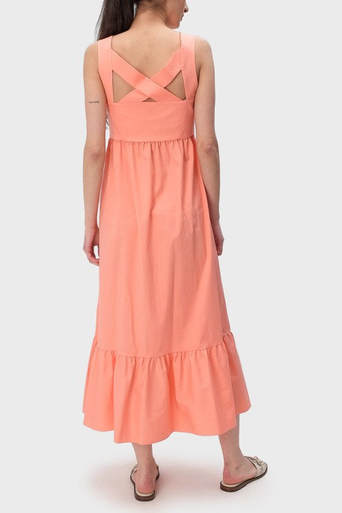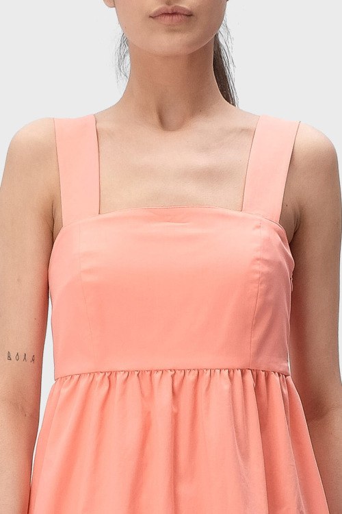 Детали: Женское персиковое платье из хлопкового микса от Hugo Boss (Хуго Босс). Длина миди, расклешенная юбка, открытый верх, широкие бретели, перекрещенные бретели на спине