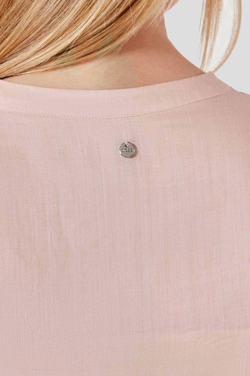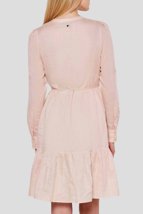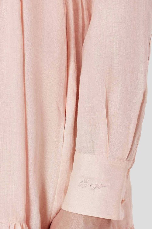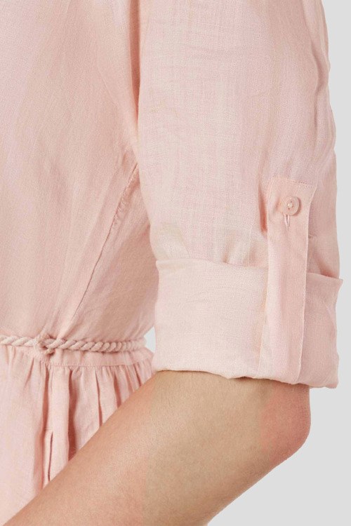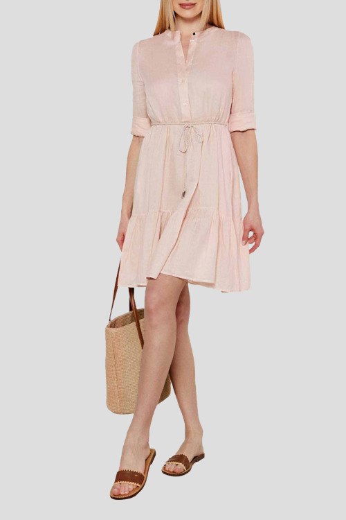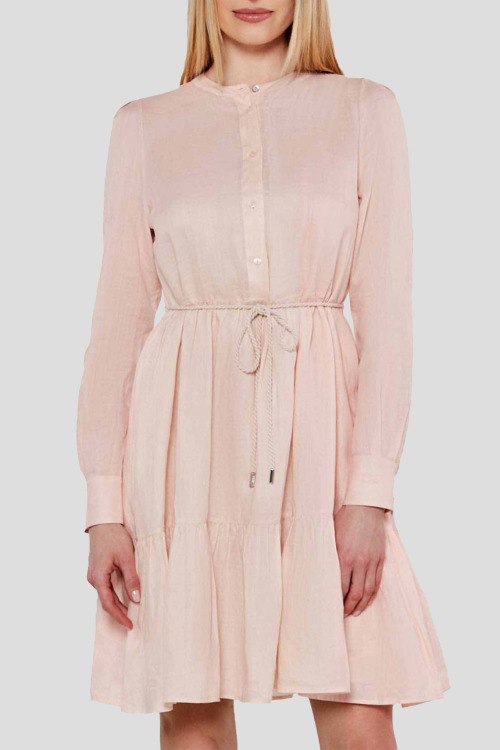 Детали: Женское пудровое платье-рубашка из ткани рами C_Diseja от Hugo Boss (Хуго Босс). Воротник-стойка, длинный рукав, застежка на пуговицы, в талии веревочный пояс, длина до колен