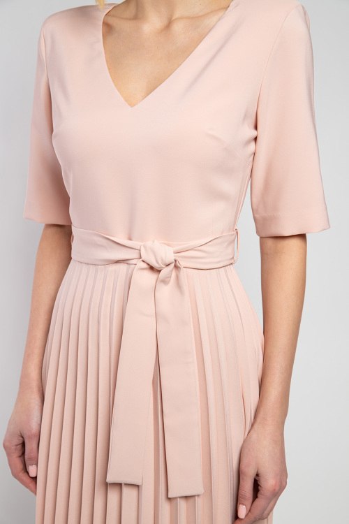 Женское розовое платье от Kocca (Кокка). Плиссированный дизайн, короткий рукав, V-образный вырез, в талии с поясом, застежка-молния на спине, длина-миди.