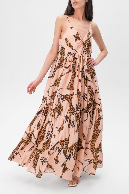 Детали: Женский персиковый хлопковый сарафан от TWINSET (Твинсет). Модель на тонких бретельках, леопардовый принт по всей поверхности, двусторонний V-образный вырез, расклешенный фасон, длина-макси
