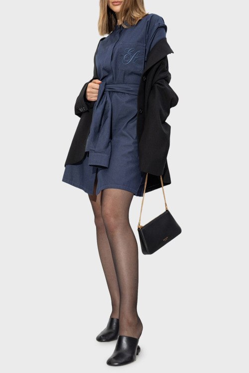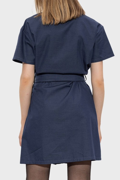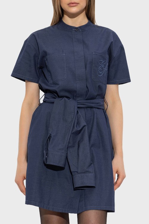 Детали: Женское синее платье из хлопкового микса от Emporio Armani (Эмпорио Армани). Короткая длина, застежка на пуговицы, короткие рукава, нагрудные карманы, вышитый логотип бренда, пояс в тон изделия