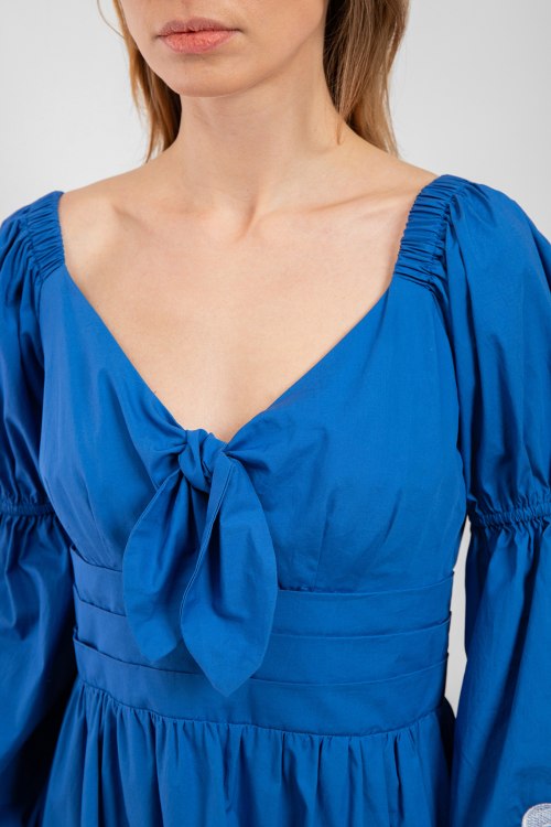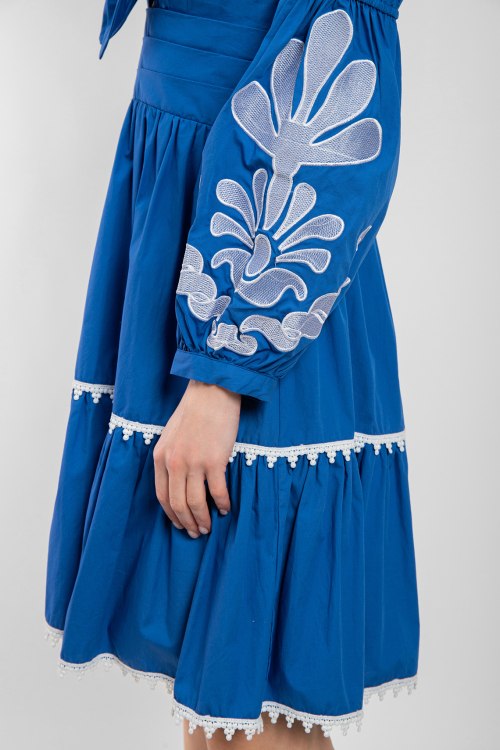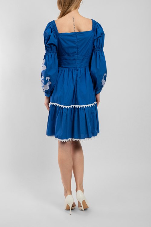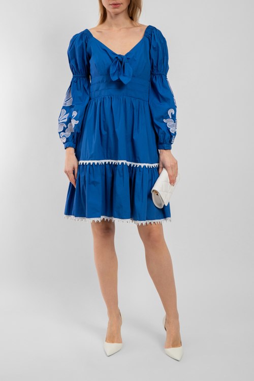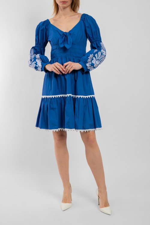 Женское синее платье из хлопкового микса от Buby S (Баби Эс). Короткая длина, объемные длинные рукава декорированы вышивкой, пришитый подъюбник, плечи на резинке, полуоткрытая спина, ткань не тянется, скрытая сзади молния. Замеры для размера М: длина: 93 см, ширина по груди: 45 см, ширина по талии : 38 см, длина рукава по внутреннему шву: 44,5 см.