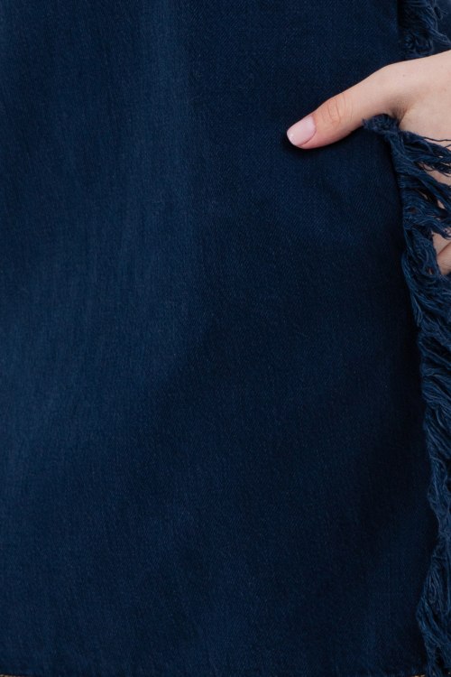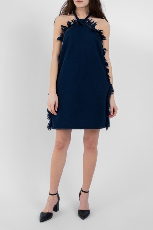 Женское темно-синее платье из хлопка от Pinko (Пинко). Короткая длина, модель с открытой спиной, без рукавов, боковые прорезные карманы, декорировано по бокам бахромой, ровный низ изделия.
