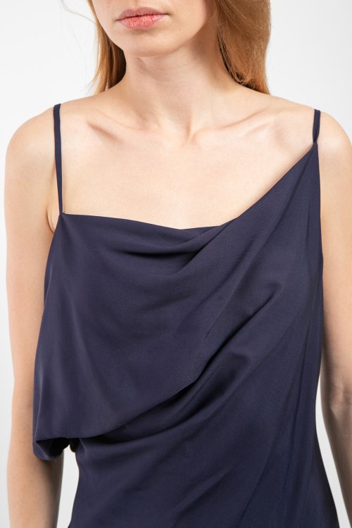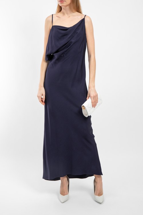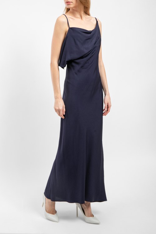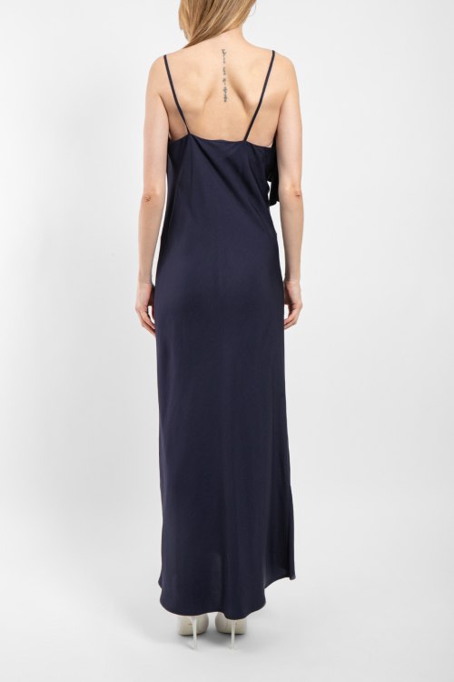 Детали: Женское темно-синее платье из вискозы Yuma от Balossa (Балосса). Модель в бельевом стиле, тонкие бретели, декор оборкой на груди, длина до щиколотки