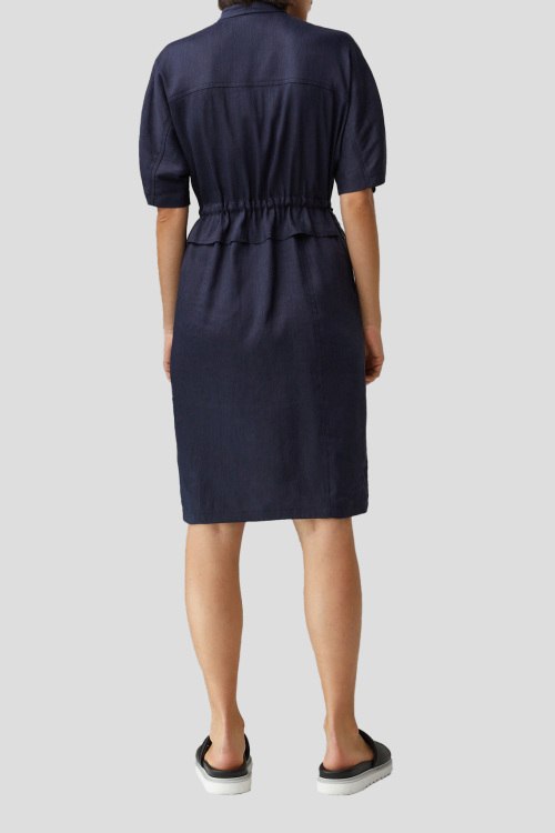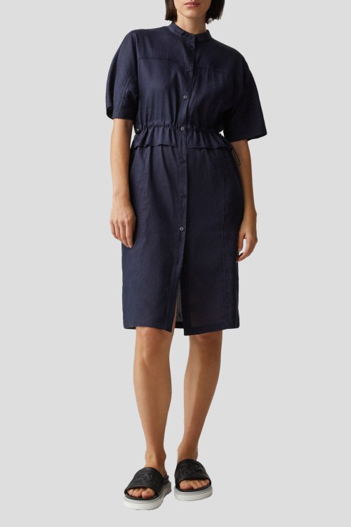 Детали: Женское темно-синее платье из льна и вискозы Rubina от Bogner (Богнер). Воротник-стойка, короткий рукав, в талии на кулиске, застежка на пуговицы по всей длине, длина-миди