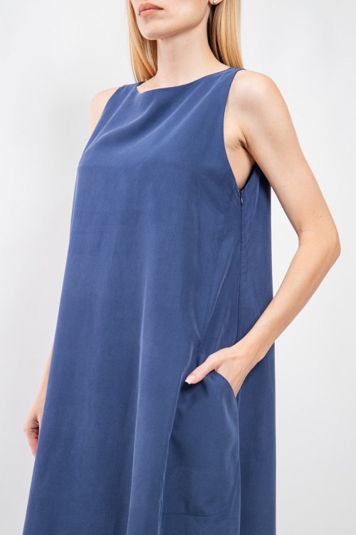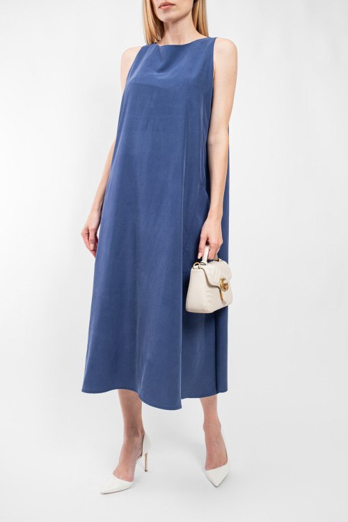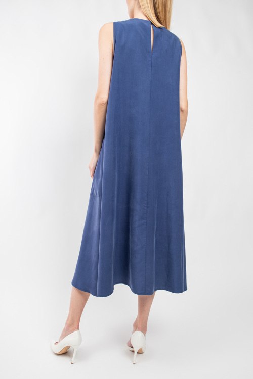 Женское темно-синее хлопковое платье от Fabiana Filippi (Фабиана Филиппи). Модель без рукавов, круглый вырез горловины, боковые карманы, застежка-молния сбоку, свободный фасон, длина-миди. Замеры для размера 40: длина: 117 см, ширина по груди: 47 см, ширина по талии: 56 см, бёдра: 67 см.