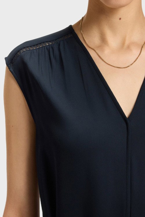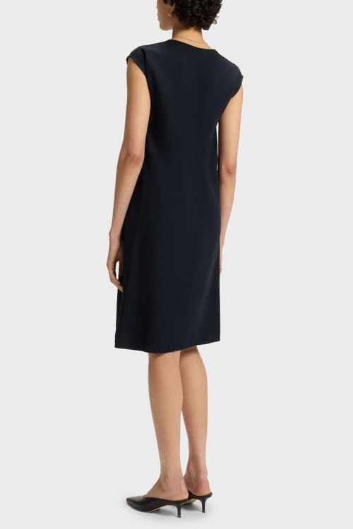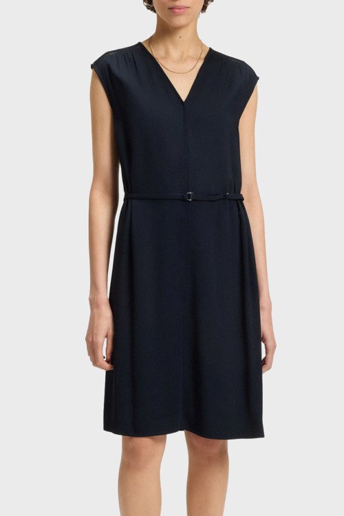 Детали: Женское темно-синее платье из вискозы Davolina от Hugo Boss (Хуго Босс). Модель без рукавов, V-образный вырез, в талии с поясом, длина до колен
