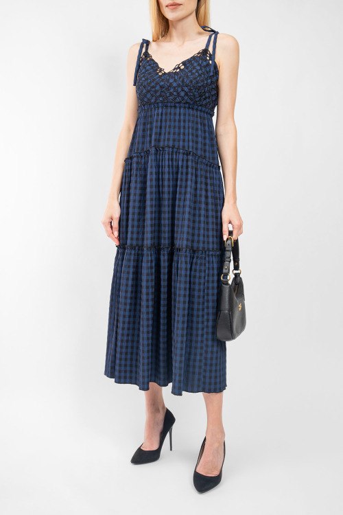 Женский темно-синий сарафан от Ice Play (Айс Плей). Модель на регулируемых бретельках, клетка по всей поверхности, верх декорирован вышивкой, длина-миди.