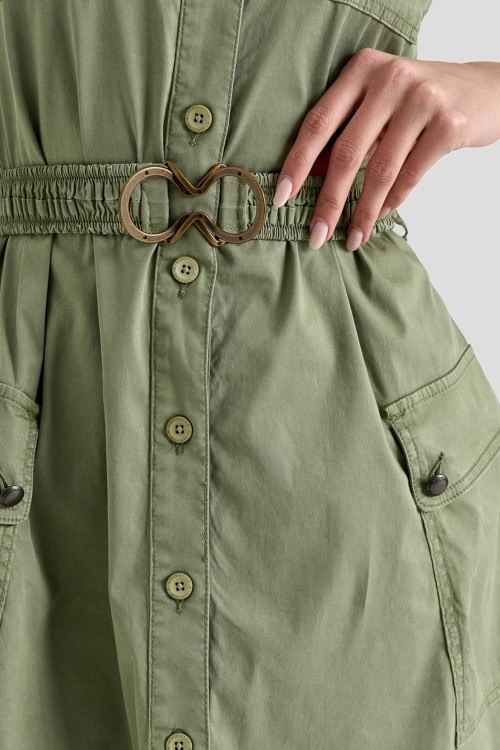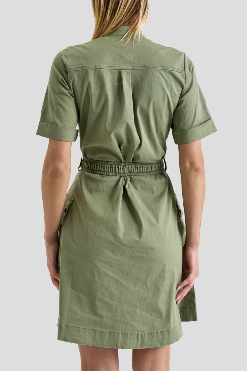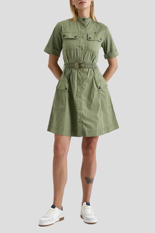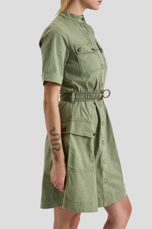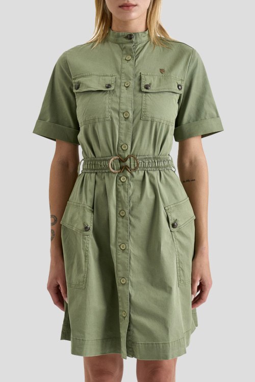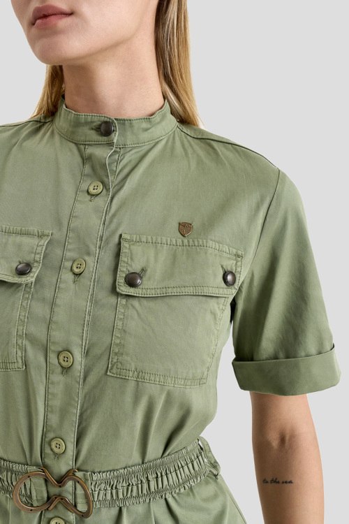 Детали: Женское светло-зеленое платье-рубашка из хлопка и лиоцелла от Aeronautica Militare (Аэронавтика Милитари). Воротник-стойка, короткий рукав, четыре передних кармана, в талии с поясом в тон изделия, застежка на пуговицы, длина выше колен