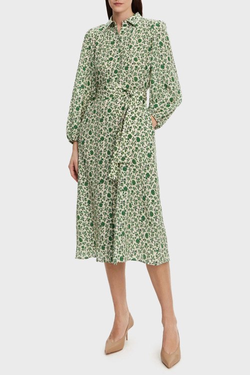 Детали: Женское зеленое платье Wales из шелка от Max Mara Weekend (Макс Мара Викенд). Длина миди, классический воротник, застежка на пуговицы, длинные рукава, прорезные карманы, цветочный принт по всей поверхности изделия, пояс в тон изделия