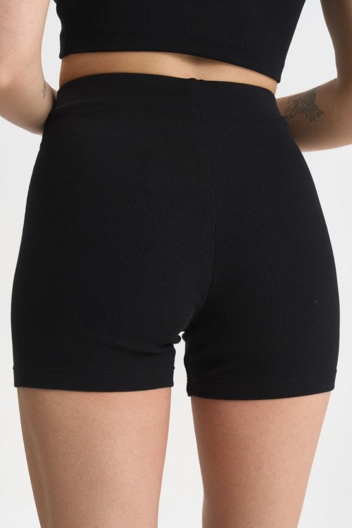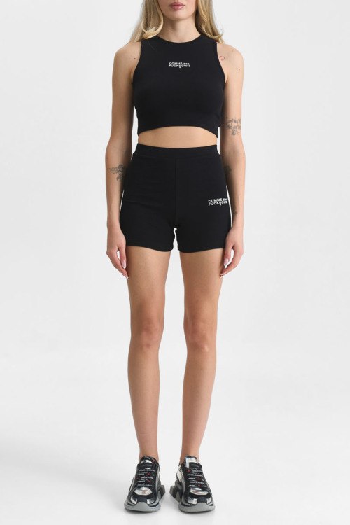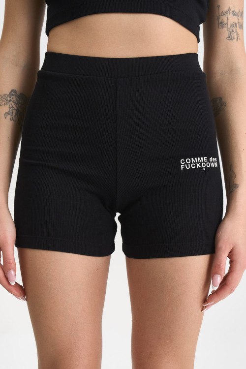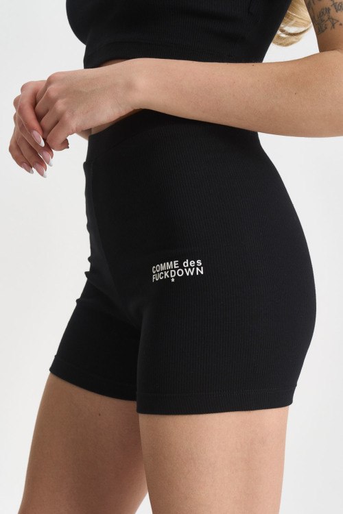 Детали: Женские черные хлопковые шорты от Comme des Fuckdown (Камм дес Факдаун). Дизайн в рубчик, логотип сбоку, облегающий фасон, длина-мини. Параметры модели: 91 см - 66 см - 96 см. Рост - 178 см. Размер на фото - S