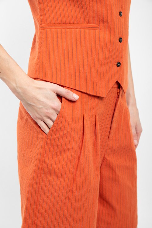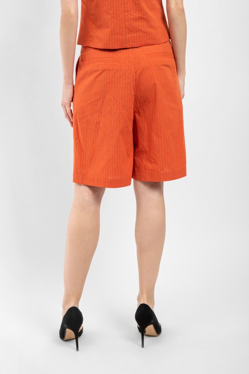 Детали: Женские коралловые шорты из хлопкового микса от Yerse (Йерс). Тонкая полоска по всей поверхности, дизайн со складками, боковые и задние карманы, широкий крой, длина до колен