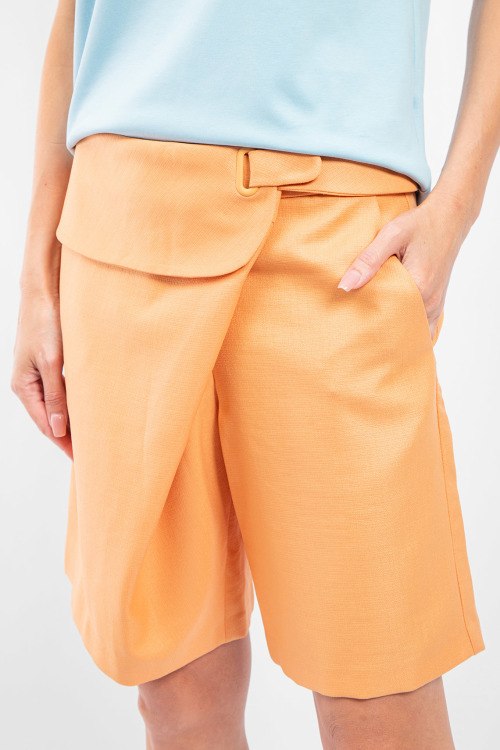 Детали: Женские шорты персикового оттенка из полиэстера от Emporio Armani (Эмпорио Армани). Фасон на запах, средняя посадка, асимметричный ремешок с застежкой, боковые прорезные карманы