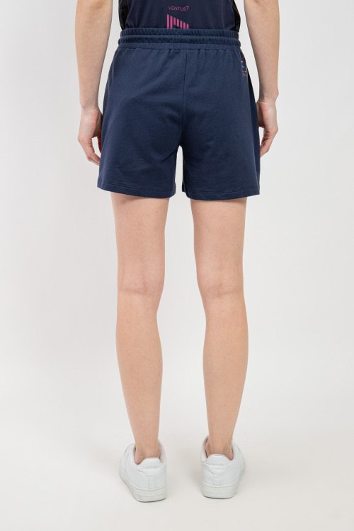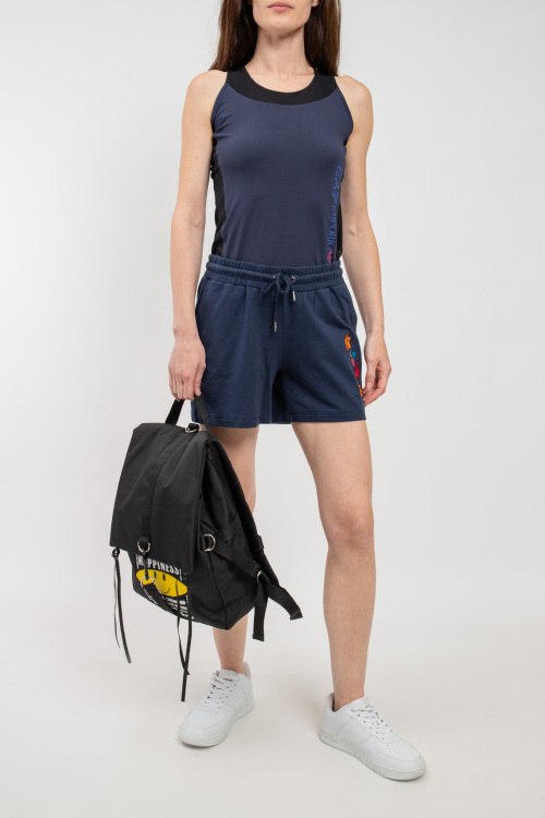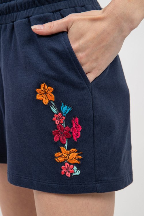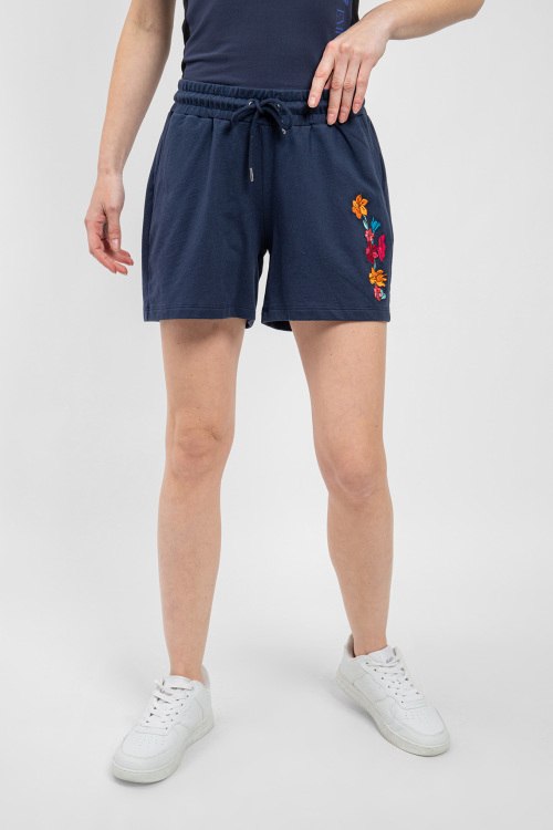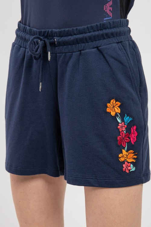 Женские темно-синие шорты из хлопка от Armani (Армани). Короткая длина, эластичная резинка на поясе с кулиской, прорезные карманы, модель декорирована вышивкой в виде цветов, логотип бренда.