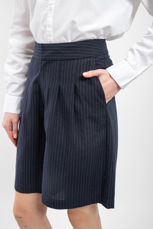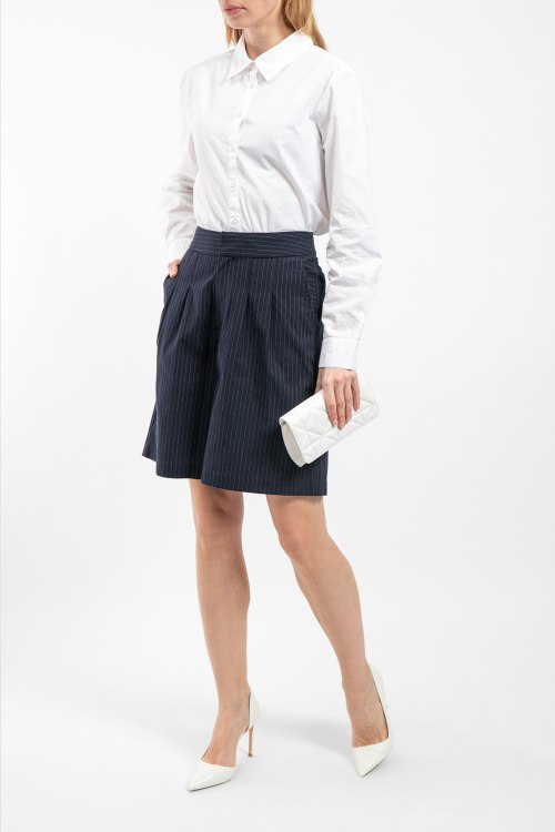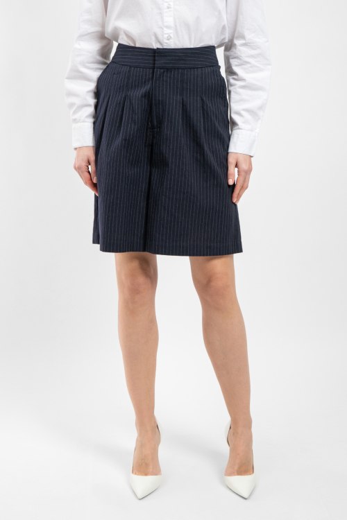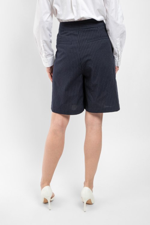 Детали: Женские темно-синие шорты из хлопкового микса от Yerse (Йерс). Тонкая полоска по всей поверхности, дизайн со складками, боковые и задние карманы, широкий крой, длина до колен