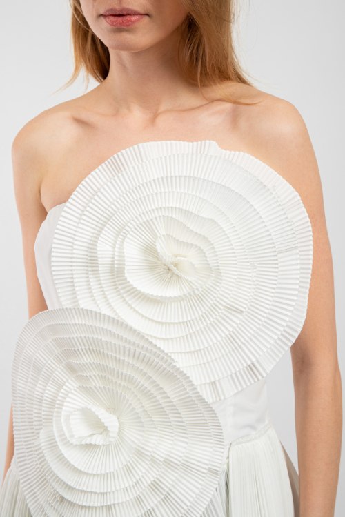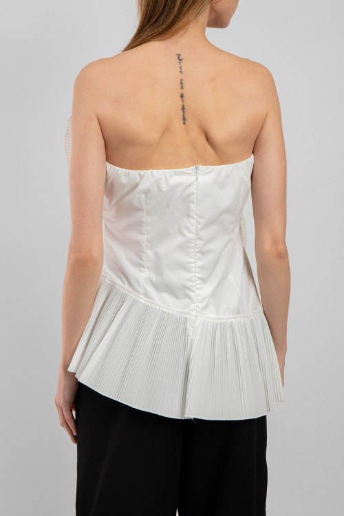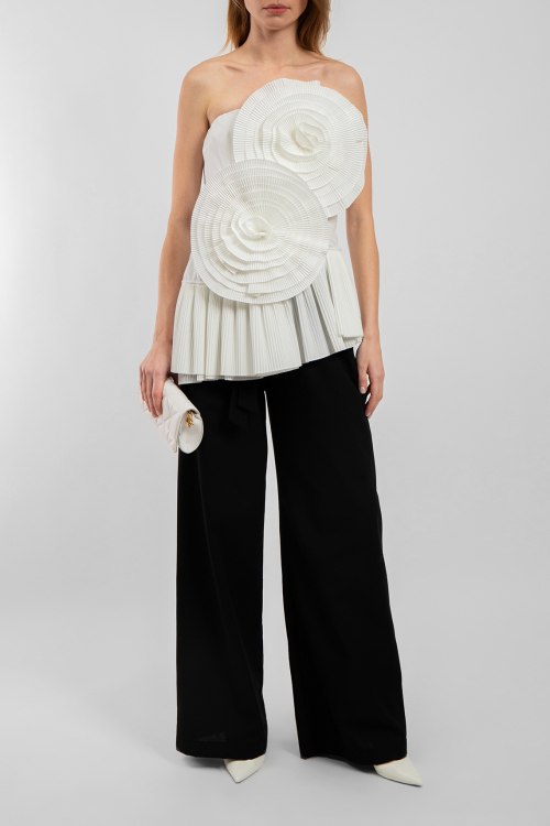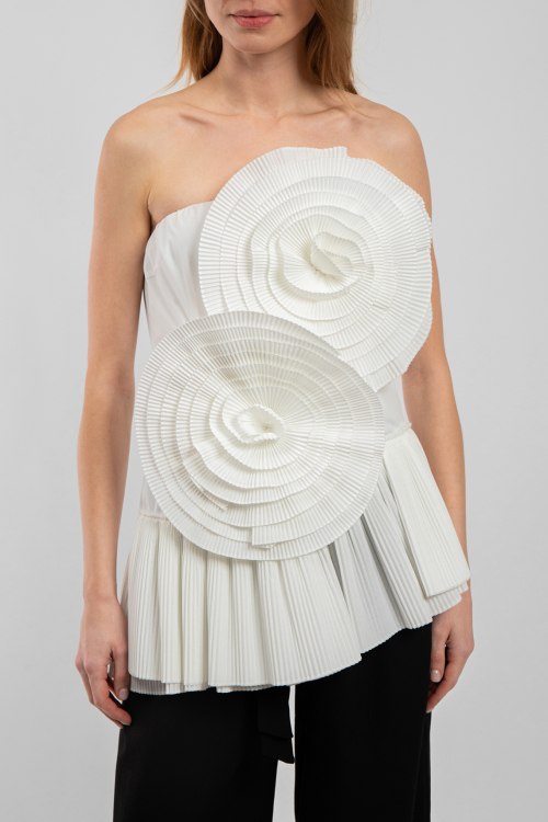 Женский белый топ из хлопка и полиэстера от Buby S (Баби Эс). Открытый верх, застежка на молнию, плиссированная вставка по низу изделия, асимметричный низ, декорирован объемными цветами. Замеры для размера S: длина: 40-52,5 см, ширина по груди: 38,5 см, ширина по талии : 37 см, ширина бедер: 44 см.