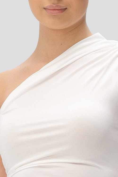 Детали: Женский белый топ из вискозного микса от Elisabetta Franchi (Елизабетта Франчи). Дизайн на одно плечо, облегающий силуэт, плиссированные вставки
