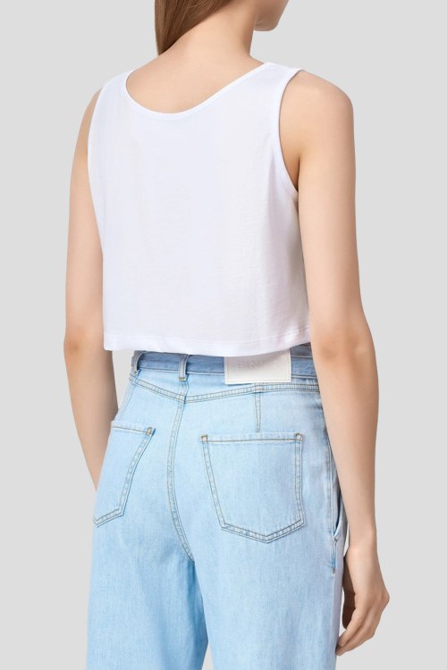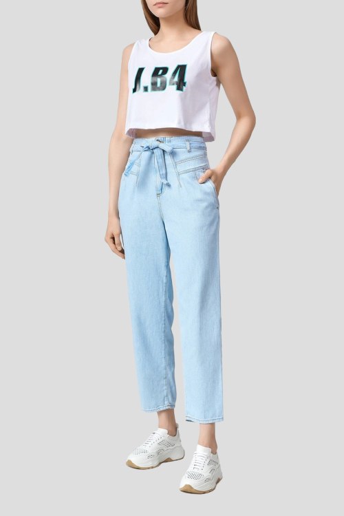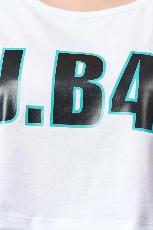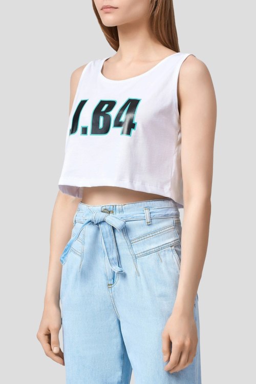 Детали: Женский белый хлопковый кроп-топ от J.B4 Just Before (Джаст Бифо). Принт с логотипом на груди, круглый вырез, без рукавов, укороченная длина