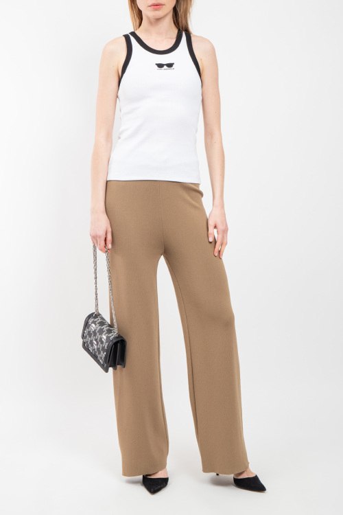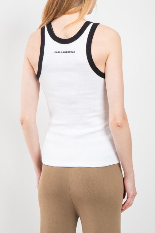 Женский белый топ из хлопкового микса от Karl Lagerfeld (Карл Лагерфельд). Классическая длина, круглый вырез горловины, без рукавов, контрастная окантовка, вышитый логотип бренда на груди.
