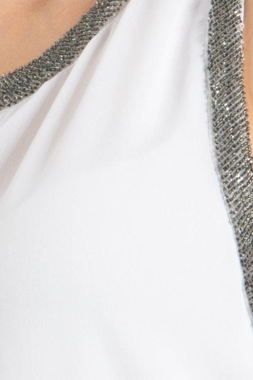 Однотонный удлиненный топ прямого кроя без рукавов. По линии горловины и рукавов моделью предусмотрена бисерная вышивка