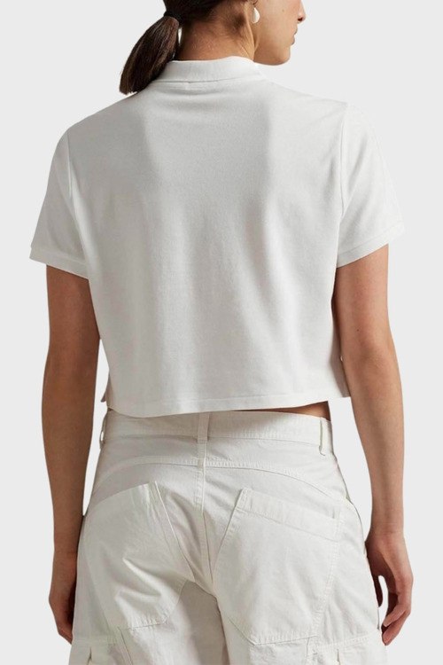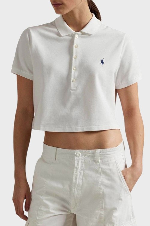 Детали: Женская белая футболка-поло из хлопкового микса от Polo Ralph Lauren (Поло Ральф Лорен). Укороченная длина, классический воротник, горловина на пуговицах, короткие рукава, вышитый логотип бренда