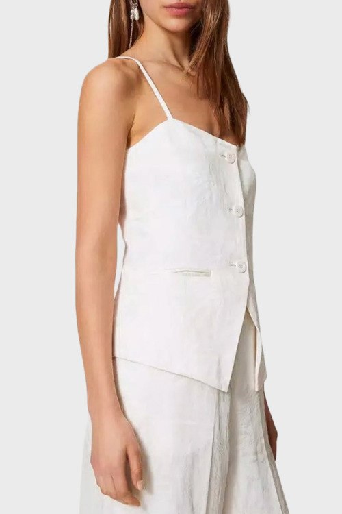 Детали: Женский белый топ из вискозы и льна от TWINSET (Твинсет). Модель на тонких бретельках, застежка на пуговицы, два прорезных кармана, классическая длина