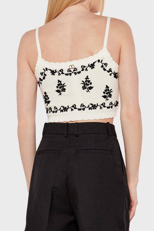 Детали: Женский белый хлопковый кроп-топ от TWINSET (Твинсет). Модель на тонких бретельках, декор цветочной вышивкой, укороченная длина