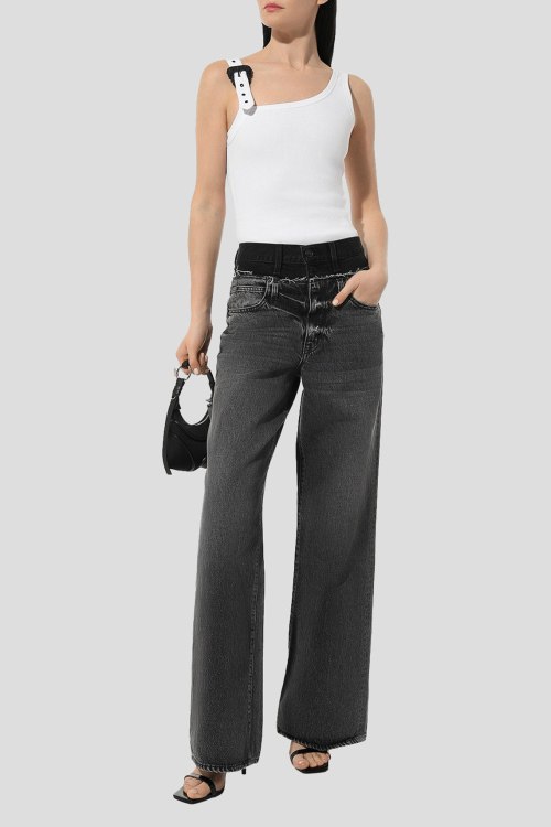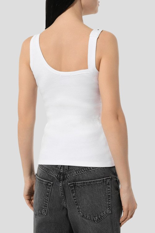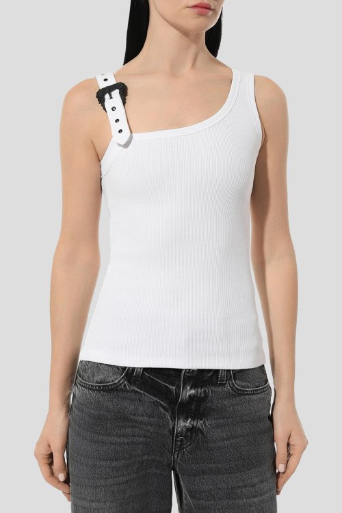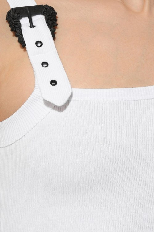 Детали: Женский белый топ из хлопкового микса от Versace Jeans Couture (Версаче Джинс Кутюр). Классическая длина, регулируемая бретель с металлической пряжкой, дизайн в рубчик