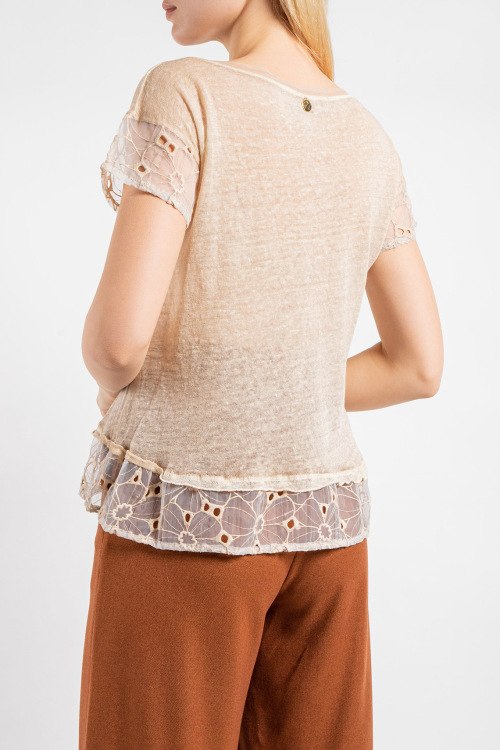 Женский бежевый топ из вискозного микса от Nana Nucci (Нана Нуччи). Классическая длина, круглый вырез горловины, короткие рукава, кружевная окантовка, металлическая нашивка с логотипом бренда.