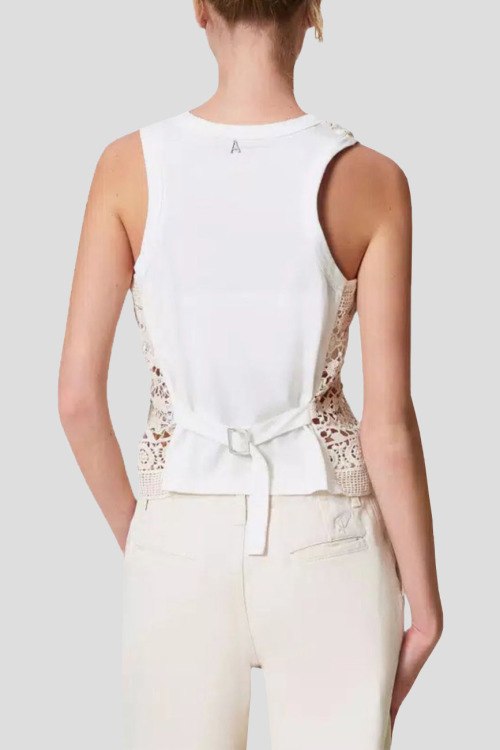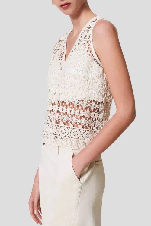 Детали: Женский бежевый хлопковый топ от TWINSET (Твинсет). Модель без рукавов, V-образный вырез, кружево макраме, классическая длина