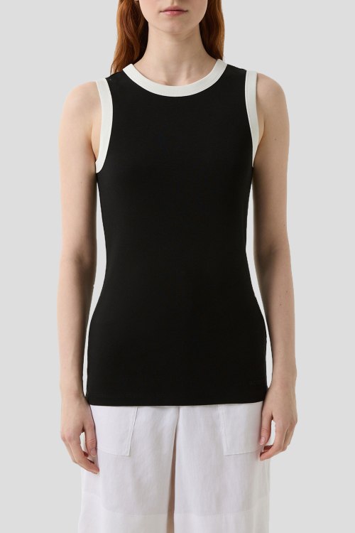 Детали: Женский черный топ Niki из хлопка от Bogner (Богнер). Классическая длина, круглый вырез горловины, без рукавов, контрастная окантовка
