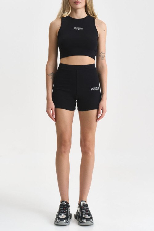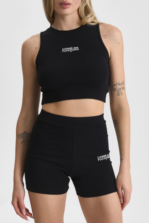 Детали: Женский черный хлопковый кроп-топ от Comme des Fuckdown (Камм дес Факдаун). Модель без рукавов, логотип на груди, укороченная длина. Параметры модели: 91 см - 66 см - 96 см. Рост - 178 см. Размер на фото - S
