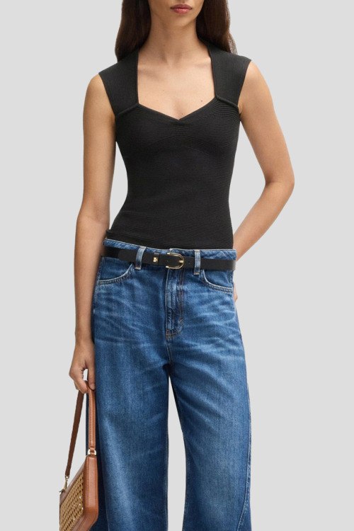 Детали: Женский черный топ C_Fobertino из вискозного микса от Hugo Boss (Хуго Босс). U-образный вырез горловины, широкие бретели, приталенный силуэт, логотип бренда, дизайн в рубчик