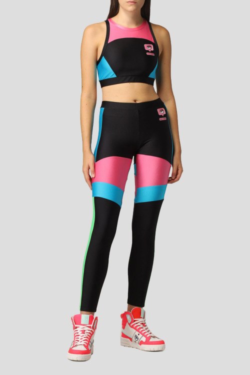 Детали: Женский черно-розовый эластичный кроп-топ от Chiara Ferragni (Кьяра Ферраньи). Дизайн колор-блок, нашивка с логотипом на груди, круглый вырез горловины, укороченная длина