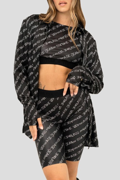 Женский черный топ из полиамида и эластана от Versace (Версаче). Укороченная длина, круглый вырез горловины, длинные рукава, прорези для большого пальца на манжетах, эластичная резинка по низу изделия, дизайн с монограммой по всей поверхности изделия